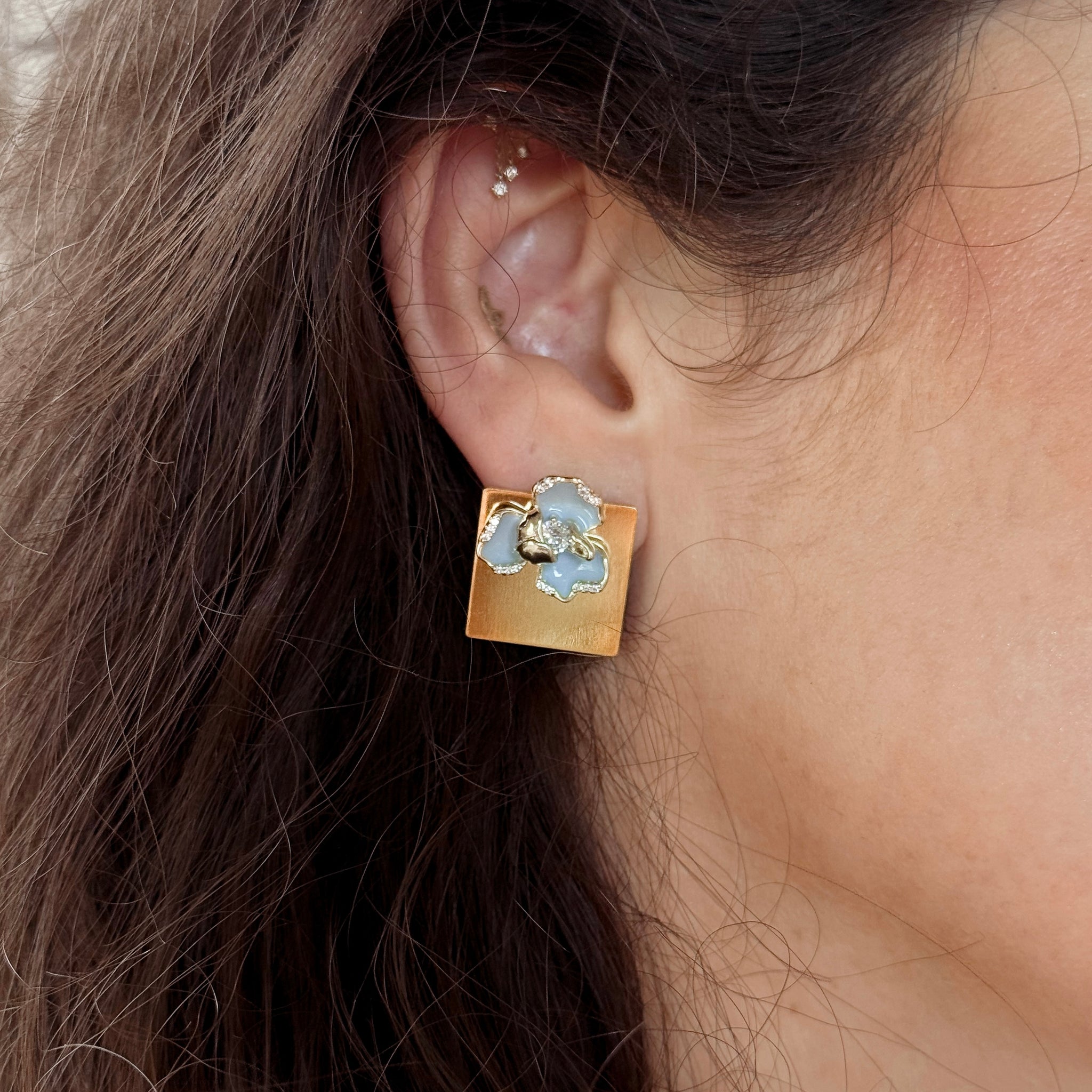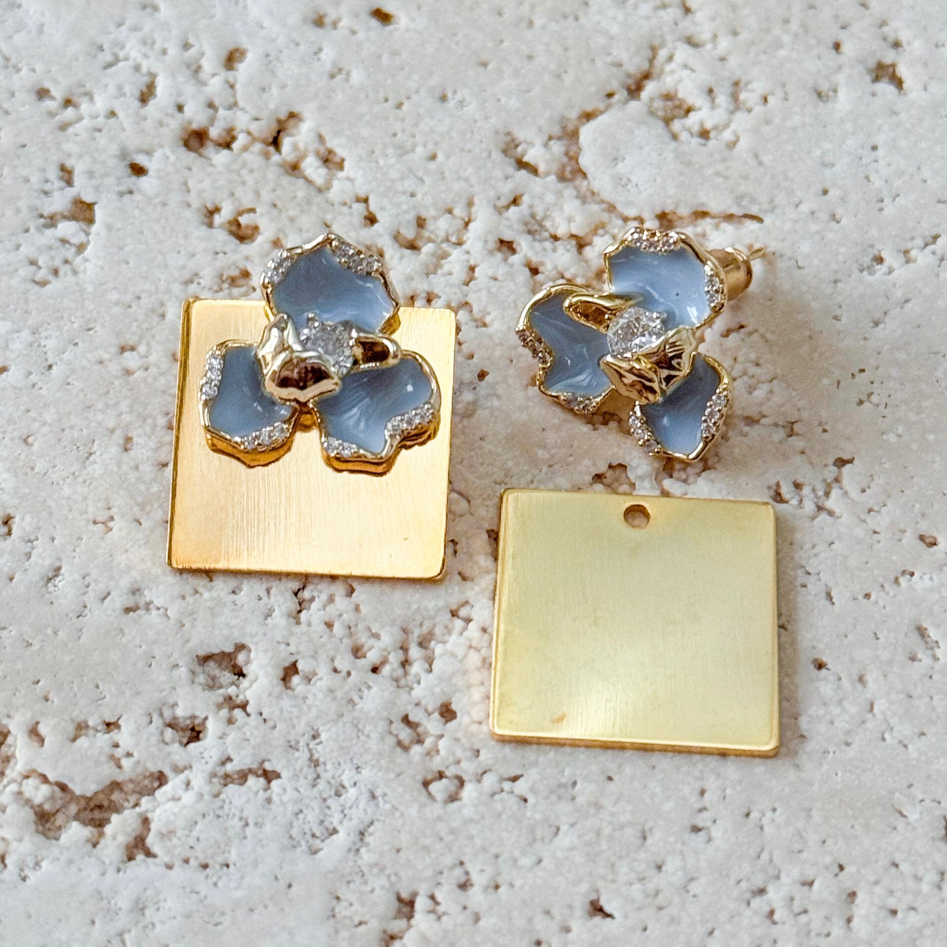 These signature earrings feature a powder blue crystal bloom stud with a removable 24k gold plate backing. Wear the delicate bloom on its own, or add the sleek square for a bold, sculptural look.